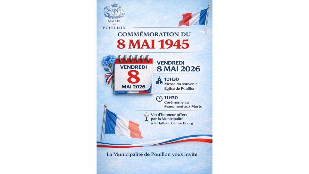 Cérémonie du 08 mai 2026 Cérémonie du 08 mai 2026 Publié le 20 avril 2026 / Dernière modification le 20 avril 2026 Cérémonie du 08 mai 2026 Publié le 20/04/2026 - Dernière modification le 20/04/2026 Le vendredi 08 mai 2026 de 11:30 à 13:00 11h30 Cérémonie au Monuments aux Morts Vin d'honneur offert par la Municipalité à la Halle