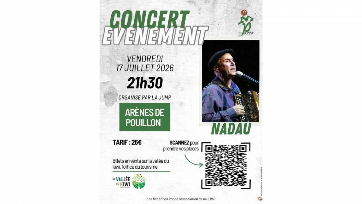 Concert évènement NADAU affiche du concert de Nadau aux arènes de Pouillon Concert évènement NADAU Publié le 14 octobre 2025 / Dernière modification le 14 octobre 2025 Concert évènement NADAU Publié le 14/10/2025 - Dernière modification le 14/10/2025 Vendredi 17 juillet 2026 à 21h30 aux Arènes de Pouillon Concert NADAU organisé par la JUMP BasketRéservation auprès de la vallée du kiwi