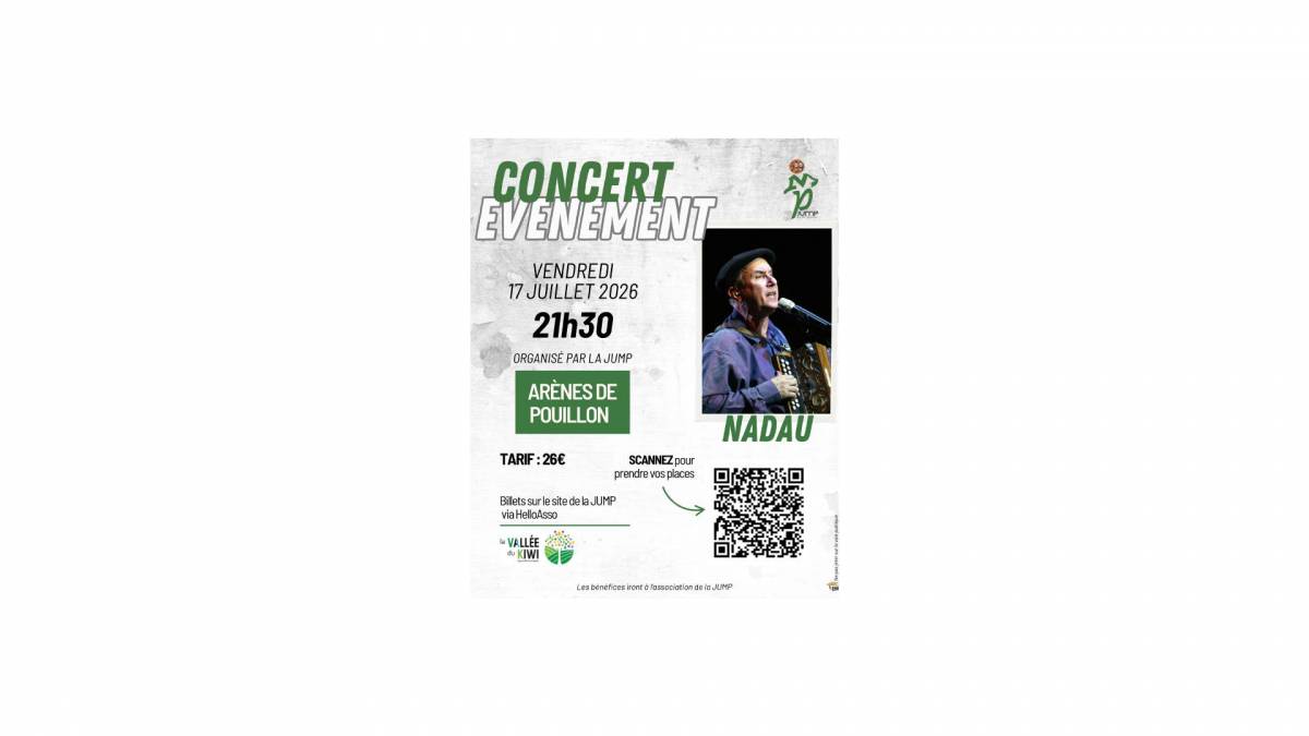 Concert évènement NADAU Concert évènement NADAU Publié le 14 octobre 2025 / Dernière modification le 27 janvier 2026 Concert évènement NADAU Publié le 14/10/2025 - Dernière modification le 27/01/2026 Le vendredi 17 juillet 2026 de 21:30 à 00:00 Organisé par : JUMP Vendredi 17 juillet 2026 à 21h30 aux Arènes de Pouillon Concert NADAU organisé par la JUMP BasketRéservation auprès de la vallée du kiwi