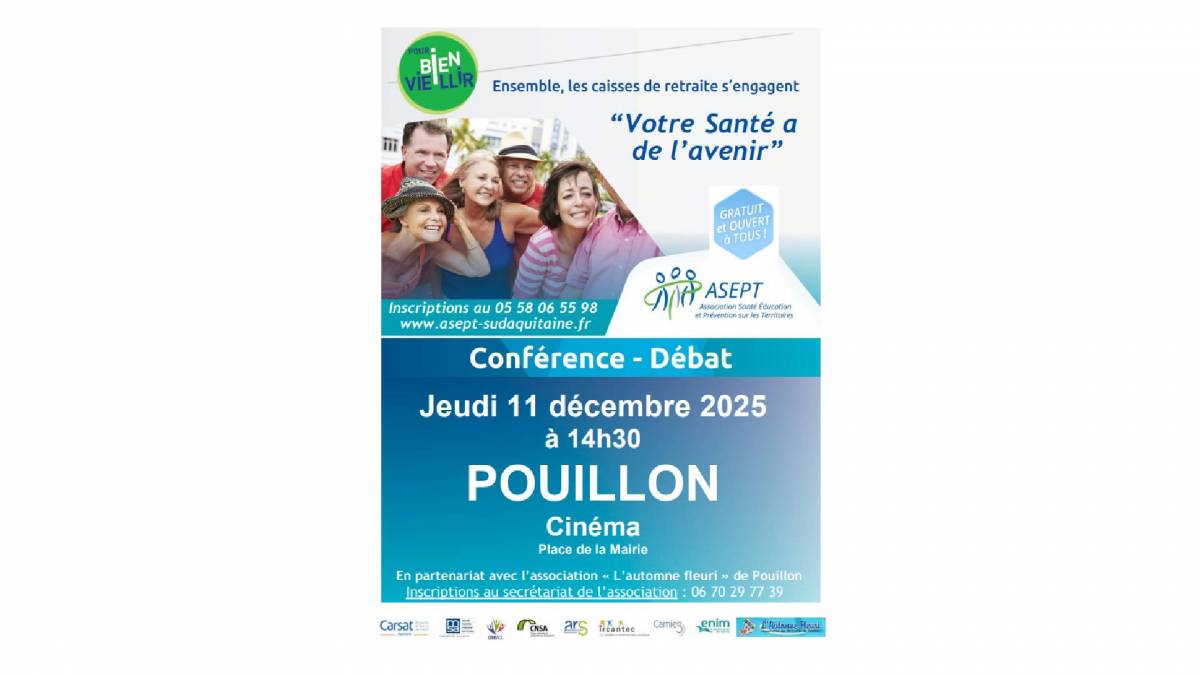 Conférence Débat Affiche de la conférence Conférence Débat Publié le 08 décembre 2025 / Dernière modification le 08 décembre 2025 Conférence Débat Publié le 08/12/2025 - Dernière modification le 08/12/2025 Le jeudi 11 décembre 2025 de 14:30 à 16:30 Organisé par : Automne Fleuri Jeudi 11 décembre 2025 à 14h30 au cinéma Sur inscription au 0558065598 Association Santé Education et Prévention sur les Territoires