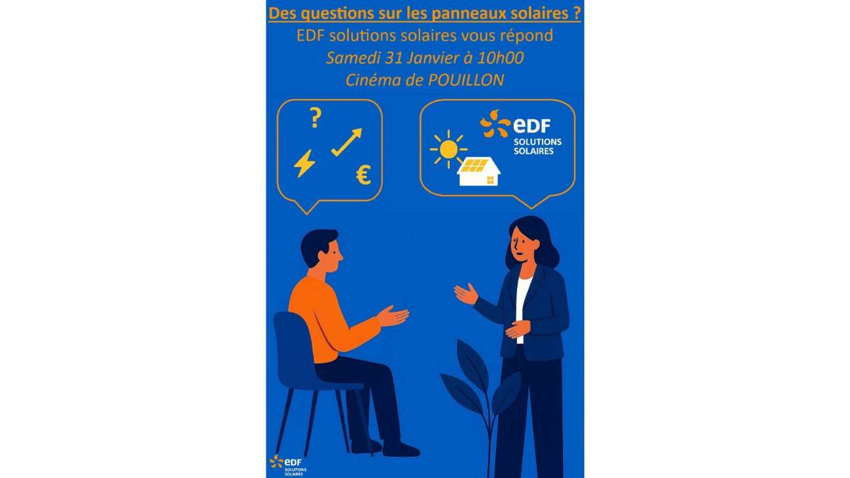 Des questions sur les panneaux solaires? Affiche de la réunion questions réponses EDF Des questions sur les panneaux solaires? Publié le 28 novembre 2025 / Dernière modification le 28 novembre 2025 Des questions sur les panneaux solaires? Publié le 28/11/2025 - Dernière modification le 28/11/2025 Le samedi 31 janvier 2026 de 10:00 à 12:00 Samedi 31 janvier à 10h00 Au Cinéma EDF solutions solaires vous répond!