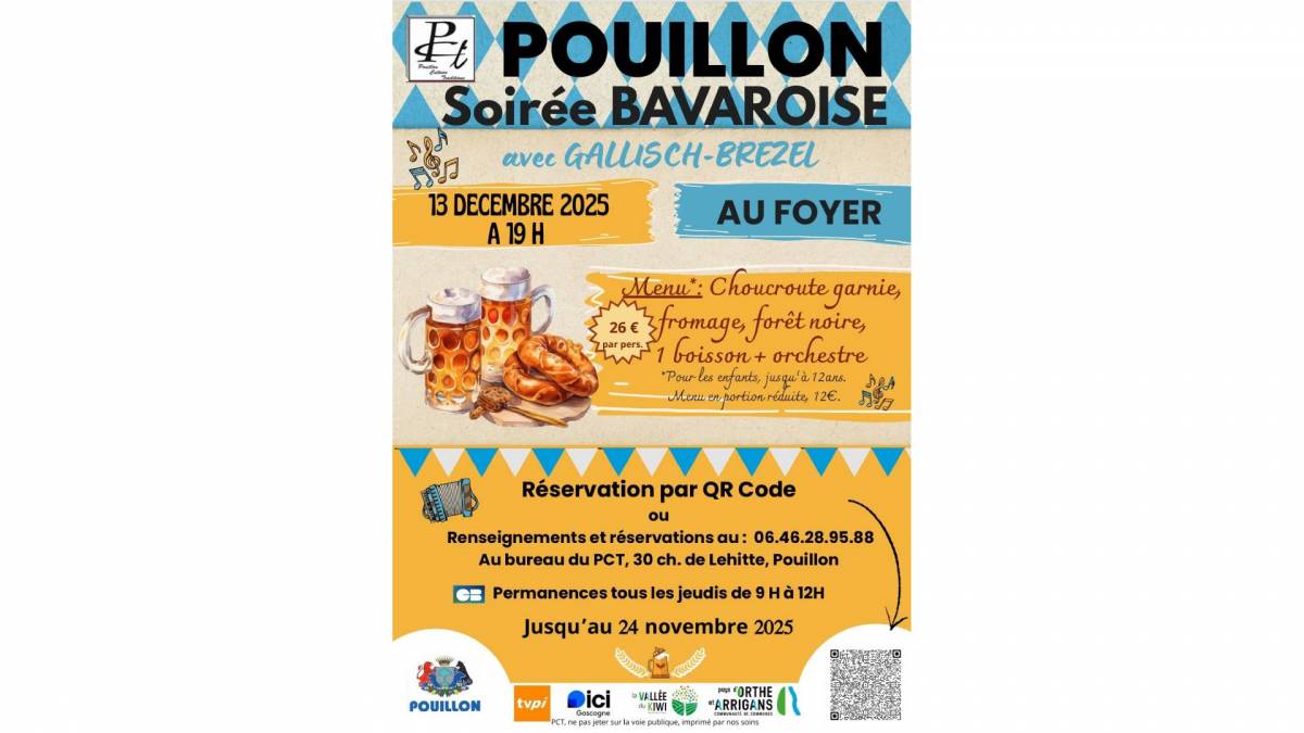 Soirée Bavaroise Affiche de la soirée bavaroise du PCT Soirée Bavaroise Publié le 14 octobre 2025 / Dernière modification le 14 octobre 2025 Soirée Bavaroise Publié le 14/10/2025 - Dernière modification le 14/10/2025 Au foyer du Hall des sports Le 13 décembre 2025 à 19h Menu: Choucroute garnie, fromage, forêt noire et 1 boissonOrchestre GALLISH-BREZEL