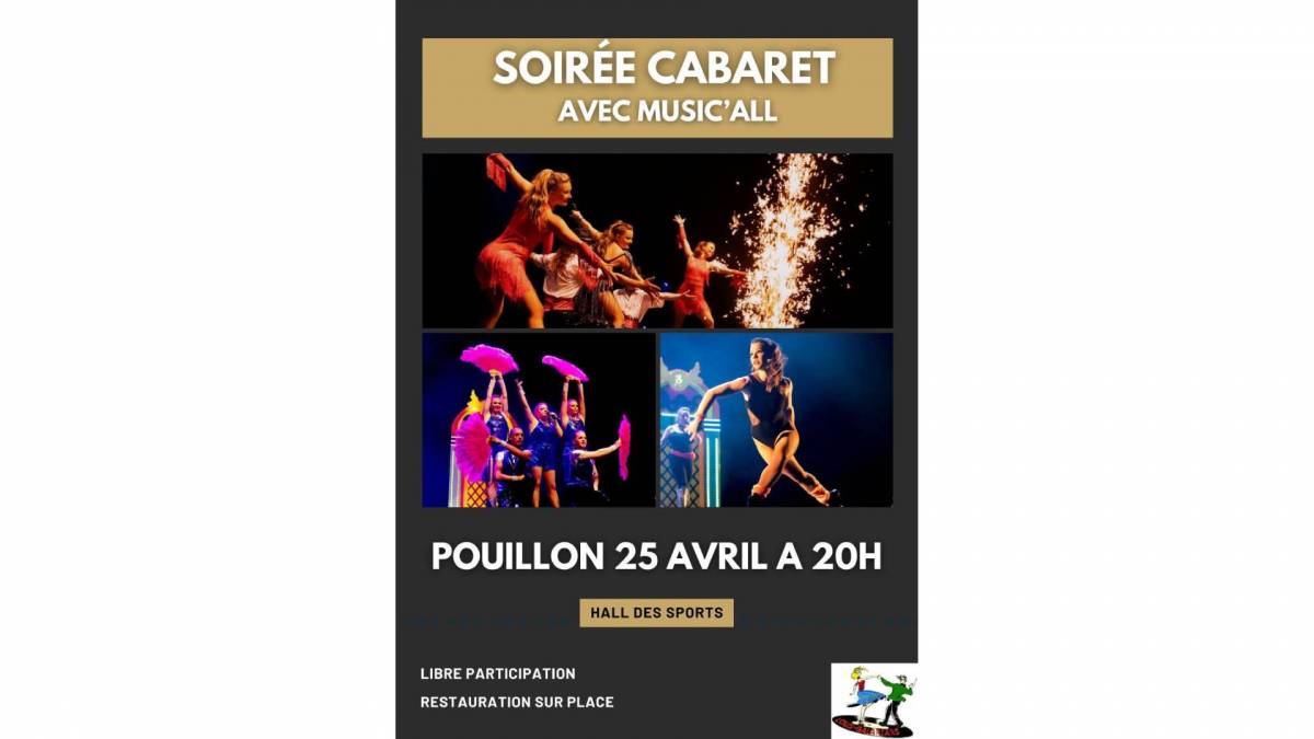 Soirée Cabaret Soirée Cabaret Publié le 18 mars 2026 / Dernière modification le 18 mars 2026 Soirée Cabaret Publié le 18/03/2026 - Dernière modification le 18/03/2026 Le samedi 25 avril 2026 de 12:00 à 23:00 Organisé par : Lous Galapians Samedi 25 Avril à 20h Organisé par Lous GalapiansRestauration sur placeLibre participation
